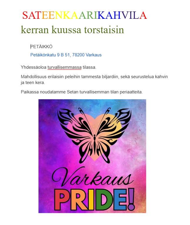 Ryhmät ovat avoimia kaikenikäisille sateenkaari-ihmisille sekä heidän tukijoilleen. Toiminta perustuu vapaaehtoisuuteen, yhdenvertaisuuteen ja luottamukseen – yhdessä rakennamme turvallisempaa ja iloisempaa Varkauden seutua kaikille.