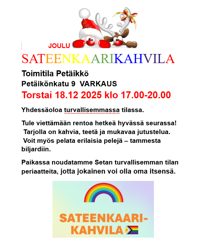 Jouluaatto Sateenkaariseniorit ry:n Viihdetoimikunta järjestää perinteisin jouluaaton etätapaamisen 24.12.2025, kello 14.00 - 20.00. Kuulemme musiikkia, osallistumme tietovisaan, nautimme yhteisen…